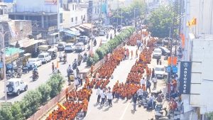 भीलवाड़ा ( बलराम वैष्णव) 1 अक्टूबर भीलवाड़ा में दुर्गा शक्ति अखाड़े के आठवें स्थापना दिवस पर हजारों युवतियों ने शौर्य संचालन निकाला। साध्वी सरस्वती ने 21 सौ युवतियों को कटार दीक्षा दी। उन्होंने बेटियों से विधर्मियों के खिलाफ खड़े होने का संदेश दिया। शहर के मुख्य चौराहों पर लोगों ने पुष्पवर्षा कर इन युवतियों का स्वागत किया।