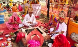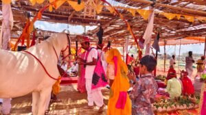 भीलवाड़ा ।। बलराम वैष्णव ):- सवाईपुर कस्बे के निकटवर्ती बनकाखेड़ा गांव में श्री मोचड़िया के मंड देवनारायण भगवान के मंदिर प्रांगण में श्री बानोड़ा बालाजी के तत्वावधान में चल रहे श्री राम कृष्ण कल्कि शक्ति महायज्ञ के चौथे दिन स्थापित देवी देवताओं की पूजा-अर्चना कर आहृवान किया, स्तंभ पूजा कर अश्व की पूजन की, 18 जोड़ों ने लगाई आहुतियां । आज शनिवार को दोपहर 2:15 बजे यज्ञ लक्ष्मी और चारभुजानाथ के फेरे होगें, इसके बाद पांच दिवसीय महायज्ञ की पूर्णाहुति महाआरती के साथ होगी । पूर्णाहुति के बाद प्रसादी का भोग लगाया प्रसादी वितरण की जाएगी, आज रात्रि को पन्ना लाल सालवी एंड पार्टी के द्वारा बगड़ावत कथा का वाचन किया जायेगा । बानोड़ा बालाजी सेवा मंडल ने बताया कि बनकाखेड़ा गांव में श्री मोचड़िया का मंड देवनारायण मंदिर प्रांगण में बानोड़ा बालाजी के तत्वावधान में आयोजित पांच दिवसीय पंच कुंडीय स्वाति नक्षत्र वायु देव यज्ञ के चौथे दिन शुक्रवार को यज्ञ शाला में जोड़ों ने स्थापित देवी देवताओं व चारभुजा नाथ, माताजी व देवनारायण भगवान की पूजा-अर्चना की । स्तंभ की पूजन, श्री राम स्तुति कर अश्व की पूजा अर्चना की । महायज्ञ में बानोड़ा बालाजी आचार्यस्व एवं पंडितों के वैदिक मंत्रोच्चार के साथ 18 जोड़ो ने हवन कुंड में भगवान श्री राम, शिवजी व षोडश मातृका सहित अन्य देवी-देवताओं की 1008 आहुतियां लगाई । इस दौरान सभी जोड़ों ने चारभुजानाथ, देवनारायण व बालाजी से घर-परिवार में सुख-समृद्धि और खुशहाली की कामना की । बड़ी संख्या में श्रद्धालु पहुंच रहे हैं जो देवनारायण भगवान, बानोड़ा बालाजी व चारभुजा नाथ के दर्शन करने के साथ ही यज्ञशाला की परिक्रमा कर रहे हैं । रात्रि में लगने वाले मेले में बड़ी संख्या में आसपास के दर्जनों गांवों से ग्रामीण पहुंच रहे हैं, जो मेले में खरीददारी करने के साथ ही यहां लगे रहे डॉलर, चकरी और झूले का आनंद ले रहे हैं । वहीं गुरुवार रात्रि को विशाल भजन संध्या का आयोजन हुआ, जिसमें विजया किशोरी एंड पार्टी के द्वारा भक्तिमय भजनों की प्रस्तुतियां दी, जिस पर भक्तगण भाव विभोर होकर नाचने झुमने लगे ।।