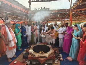 भीलवाड़ा ( बलराम वैष्णव):- क्षेत्र के त्रिवेणी संगम में शिव मंदिर प्रांगण में श्री बानोड़ा बालाजी के तत्वावधान में चल रहे श्री राम कृष्ण कल्कि शक्ति महायज्ञ की पांचवें दिन यज्ञ लक्ष्मी और चारभुजानाथ के फेरे के साथ महायज्ञ की पूर्णाहुति हुई । महायज्ञ की पूर्णाहुति पर 17 जोड़ों ने हवन कुंडों में आहुतियां लगाई । बानोड़ा बालाजी सेवा मंडल ने बताया कि त्रिवेणी संगम में शिव मंदिर प्रांगण में बानोड़ा बालाजी के तत्वावधान में आयोजित पांच दिवसीय पंच कुंडीय महायज्ञ में आसपास के 25 गांवों के 40 बैवाणो की भव्य शोभायात्रा के साथ विशाल कलश यात्रा के साथ हुई । पांचवें दिन शुक्रवार को प्रातः 7 बजे यज्ञ शाला में स्थापित देवी देवताओं व चारभुजा नाथ व भोलेनाथ की पूजा-अर्चना की । महायज्ञ में बानोड़ा बालाजी आचार्यस्व एवं पंडितों के वैदिक मंत्रोच्चार के साथ 17 जोड़ो ने हवन कुंड में भगवान श्री राम, शिवजी व षोडश मातृका सहित अन्य देवी-देवताओं की 1008 आहुतियां लगाई, दोपहर 2:15 बजे अश्व की पूजा कर यज्ञ लक्ष्मी और चारभुजानाथ के फेरे हुए, फेरे के दौरान महिलाओं ने मंगल गीत गाते हुए नाचते गाते हुए चले, बडे़ ही धूमधाम और हर्षोल्लास के साथ चारभुजानाथ का विवाह सम्पन्न हुआ । शाम 3:15 बजे महायज्ञ की पूर्णाहुति के बाद महा आरती की गई । इसके बाद महाप्रसादी का भोग लगाकर प्रसादी वितरण की । यज्ञ शाला में सभी जोड़ों ने घर-परिवार में सुख-समृद्धि और खुशहाली की कामना की । महायज्ञ की पूर्णाहुति पर बड़ी संख्या में आसपास के गांवों से श्रद्धालु पहुंचे, जो भोलेनाथ, बानोड़ा बालाजी व चारभुजा नाथ के दर्शन करने के साथ ही यज्ञशाला की परिक्रमा कर रहे हैं । ग्रामीण महिलाओं युवतियां ने मेले में जमकर खरीददारी की । मेले में खरीददारी करने के साथ ही यहां लगे डॉलर चकरी और झूले का आनंद लिया ।।